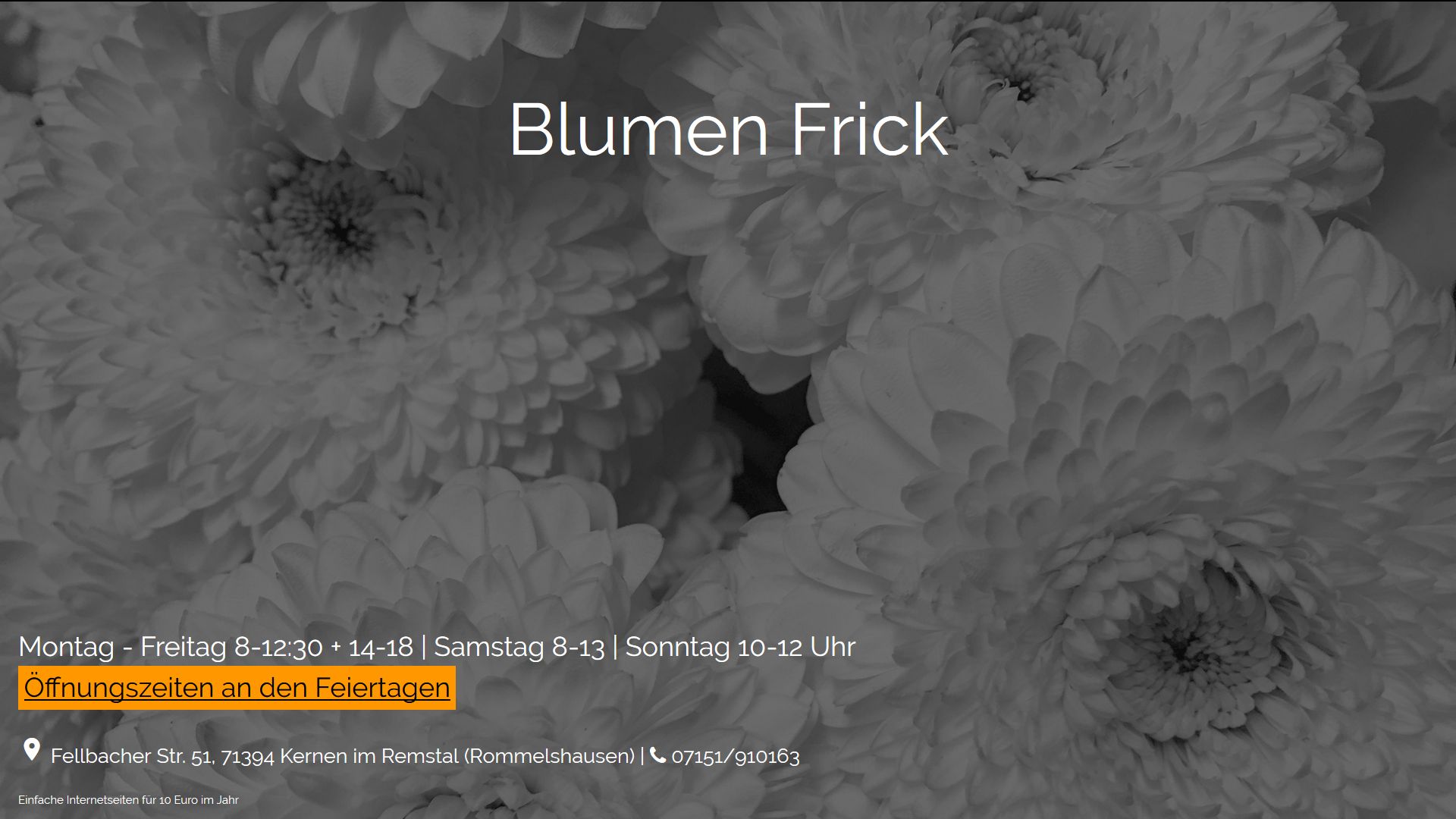 Falls es jemand gar nicht hinbekommt seine eigene Internetseite zu machen, dem helfe ich privat für 10 Euro im Jahr. Dabei ist die Domainregistrierung, die alleine 4,50 Euro kostet. Das ist also nichts zum Geldverdienen, sondern nur ein Hilfsangebot, weil gerade ältere Ladeninhaber eine regelrechte Fobie vor dem Internet haben. Voraussetzung ist, dass die Seite so einfach wie dieses Beispiel ist. Einfach nur Öffnungzeiten und Kontaktdaten - fertig. Manchmal muss ja auch gar nicht mehr auf einer Homepage stehen...